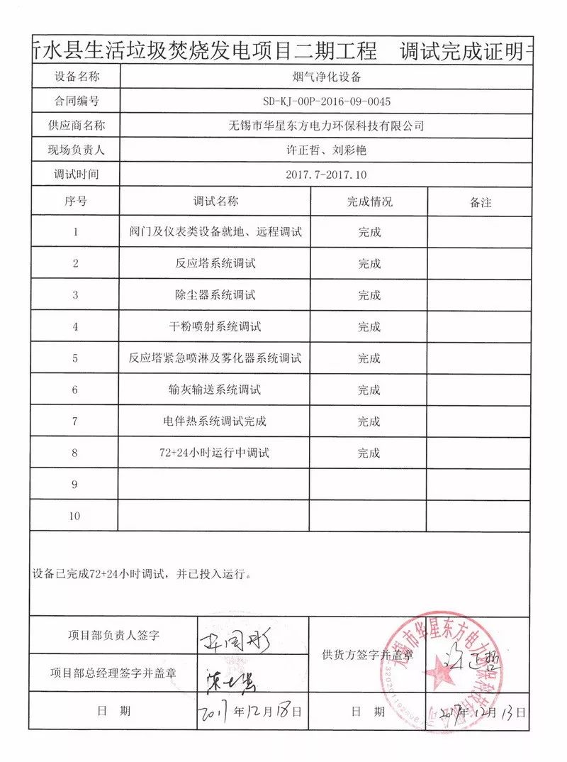 我公司中標(biāo)承建的山東臨沂沂水二期1x300t/d垃圾焚燒煙氣凈化工程于12月18日通過(guò)整體竣工驗(yàn)收,整體工程項(xiàng)目竣工。煙氣處理工藝半干法脫酸+干法+活性炭噴射+布袋除塵器,現(xiàn)整個(gè)系統(tǒng)現(xiàn)運(yùn)行穩(wěn)定,為我公司 EPC項(xiàng)目。