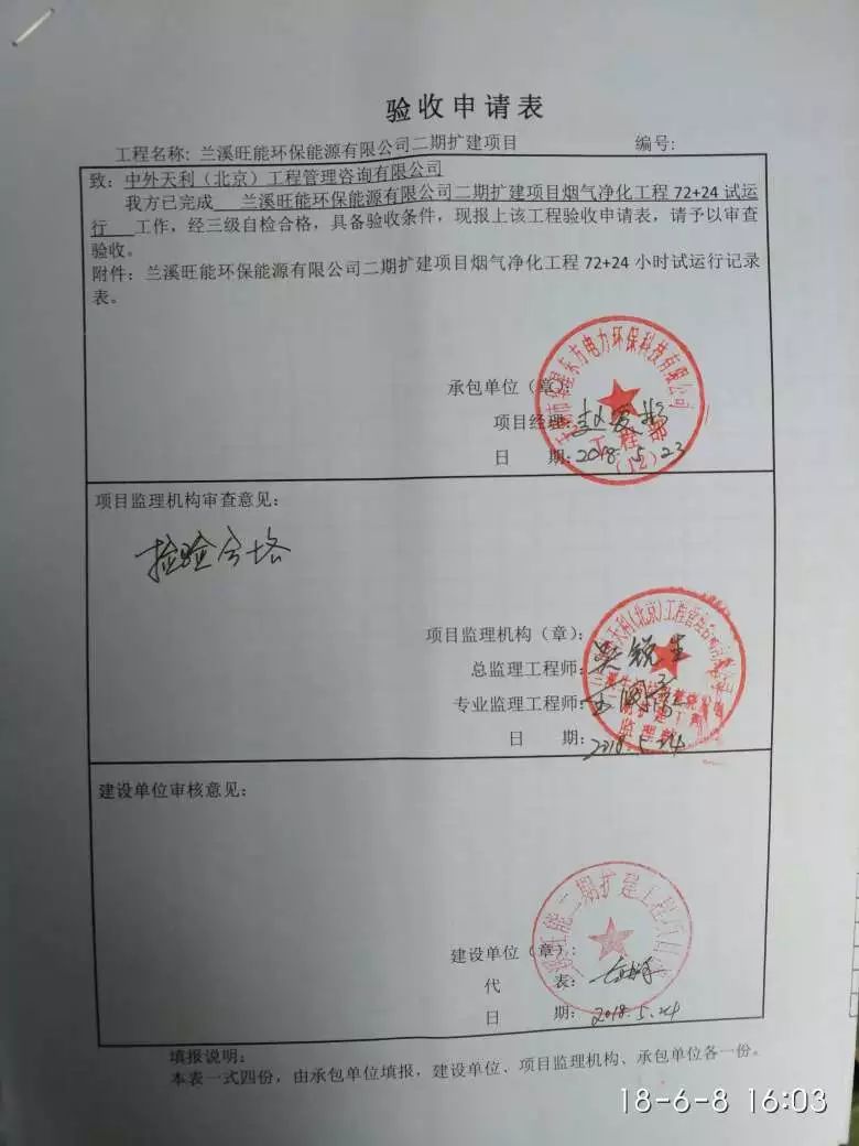 我公司中標承建的浙江蘭溪1x400t/d生活垃圾焚燒煙氣凈化工程于2018年5月24通過72+24小時驗收,并通過了整體竣工驗收。該項目采用SNCR脫硝+旋轉(zhuǎn)霧化半干法脫酸+干法(碳酸氫鈉)+活性炭吸附+布袋除塵器+飛灰輸送+飛灰穩(wěn)定化等凈化工藝,現(xiàn)整個系統(tǒng)現(xiàn)運行穩(wěn)定,為我公司 EPC項目。