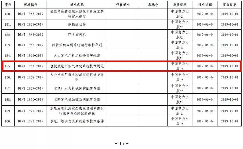 其中,由我司和恩菲院共同主編完成的《垃圾發(fā)電廠煙氣凈化系統(tǒng)技術(shù)規(guī)范》這一行業(yè)標(biāo)準(zhǔn)(標(biāo)準(zhǔn)編號(hào):DL/T1967-2019),也經(jīng)國家能源局批準(zhǔn)予以發(fā)布,將于2019年10月01日正式實(shí)施。