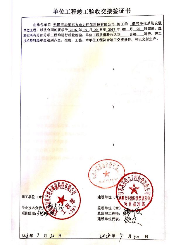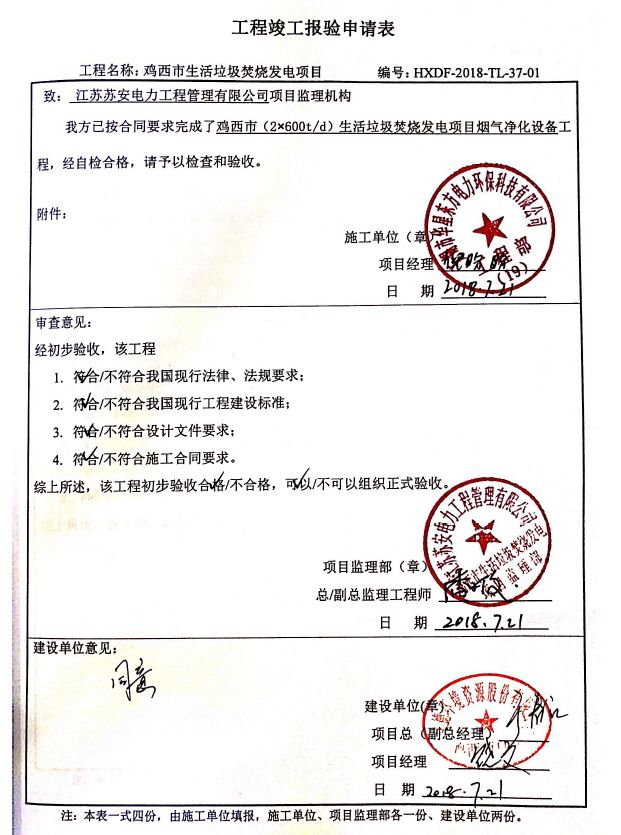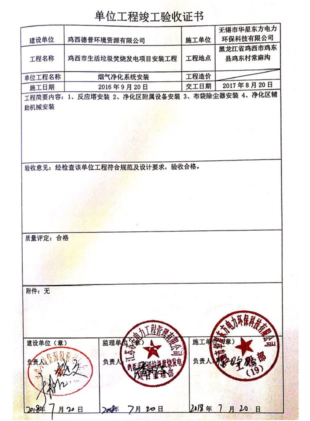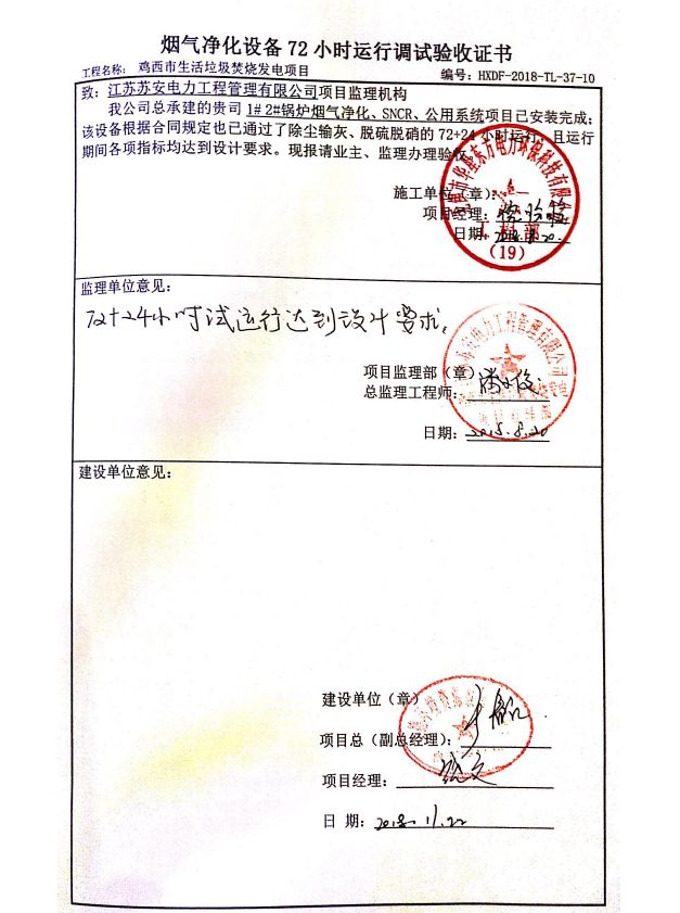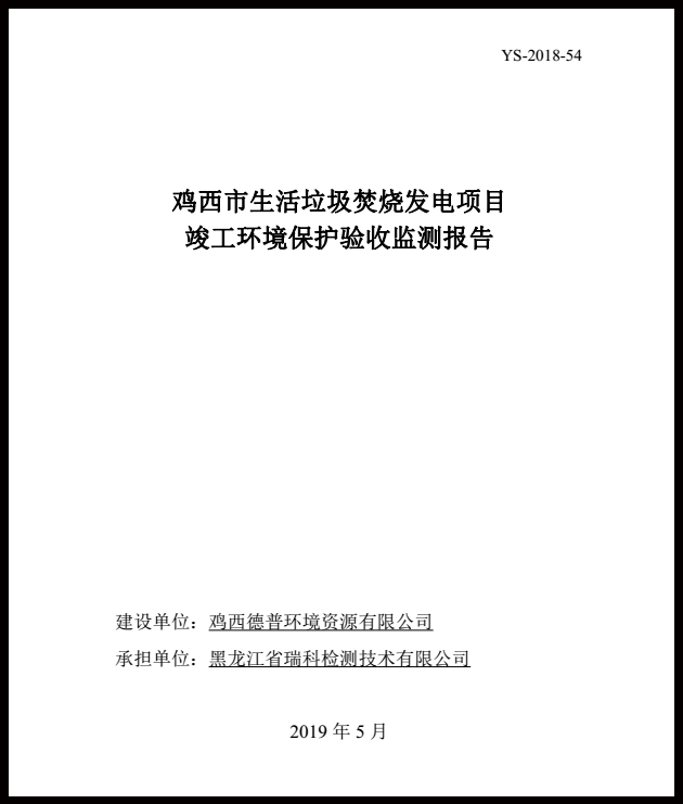 我公司承建的雞西市生活垃圾焚燒發(fā)電項(xiàng)目于2019年5月通過(guò)環(huán)保驗(yàn)收,現(xiàn)該項(xiàng)目運(yùn)行穩(wěn)定,各項(xiàng)參數(shù)符合設(shè)計(jì)要求。