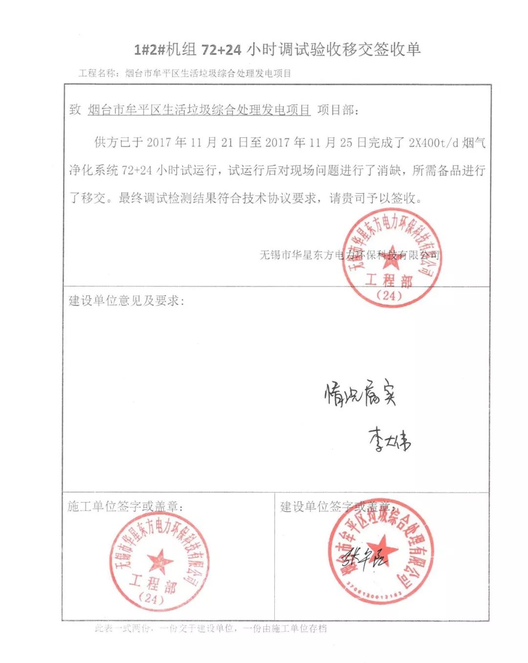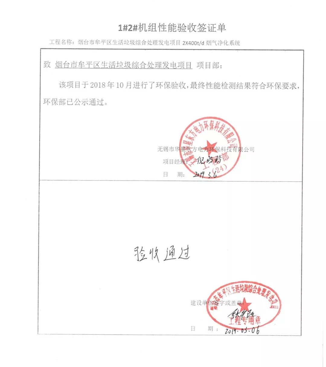 我公司承建的煙臺(tái)市牟平區(qū)生活垃圾綜合處理發(fā)電項(xiàng)目煙氣凈化工程于2018年10月通過環(huán)保驗(yàn)收,現(xiàn)該項(xiàng)目運(yùn)行穩(wěn)定,各項(xiàng)參數(shù)符合設(shè)計(jì)要求。