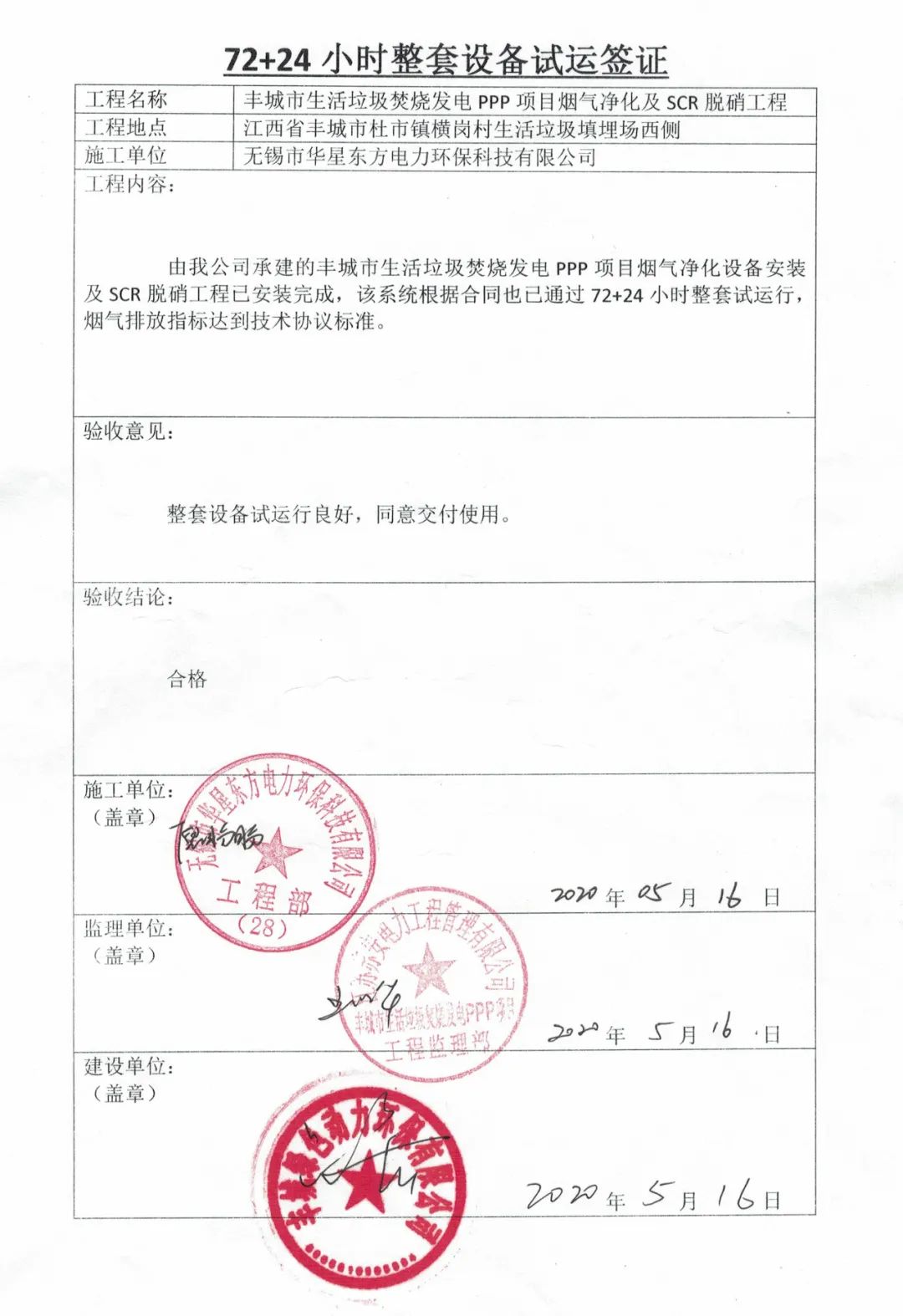 我公司承建的江西省豐城市生活垃圾焚燒發(fā)電PPP項(xiàng)目煙氣凈化工程于2020年05月16日通過(guò)72+24小時(shí)運(yùn)行驗(yàn)收。