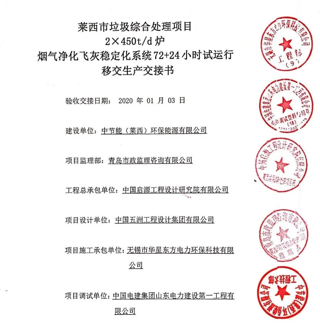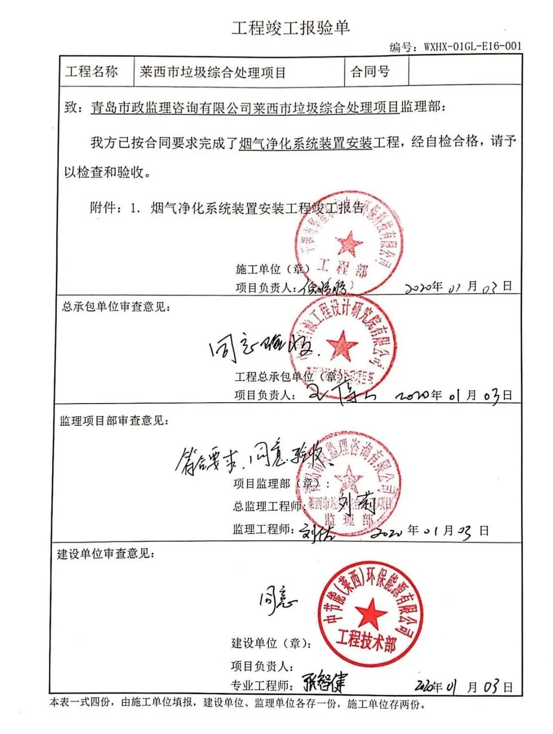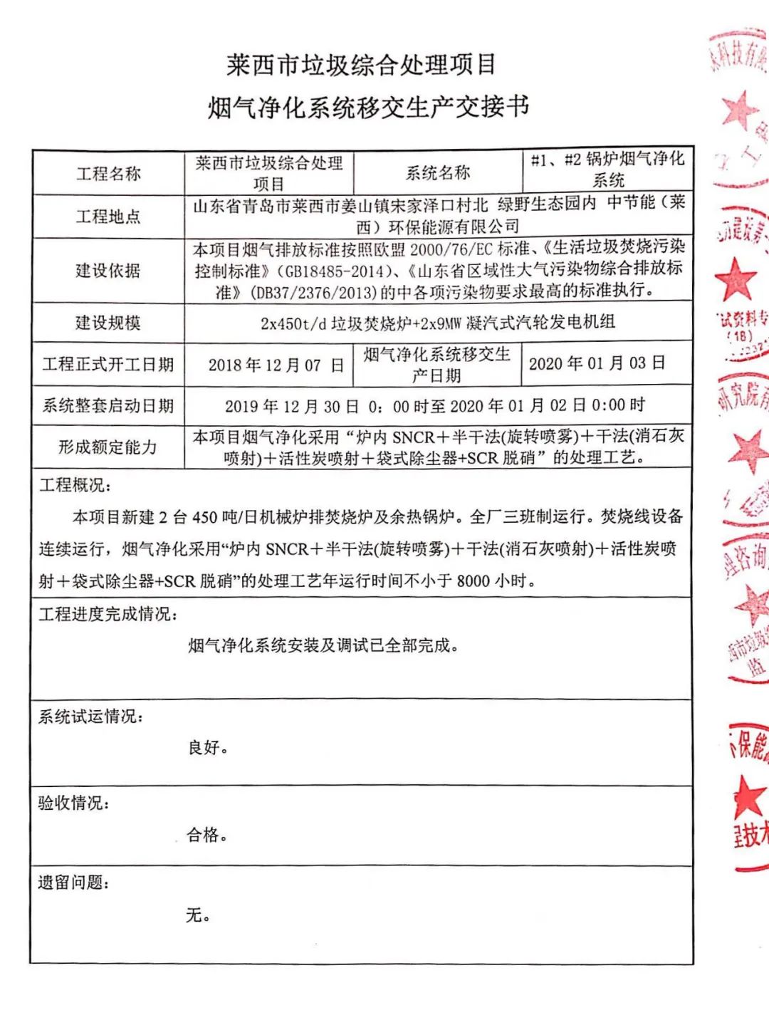 我公司承建的中節(jié)能(萊西)生活垃圾焚燒發(fā)電項(xiàng)目煙氣凈化工程于2020年1月3日通過竣工驗(yàn)收。
