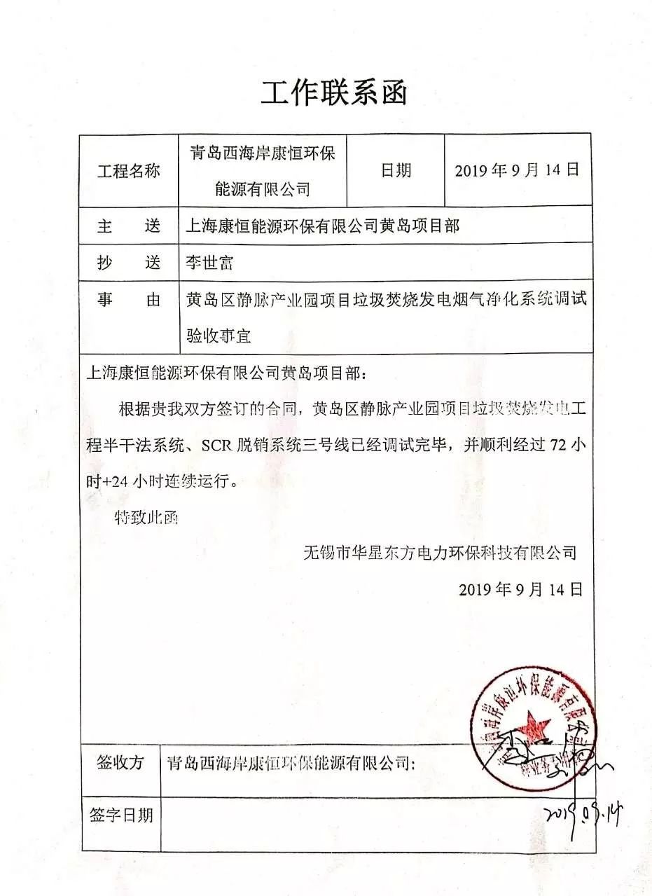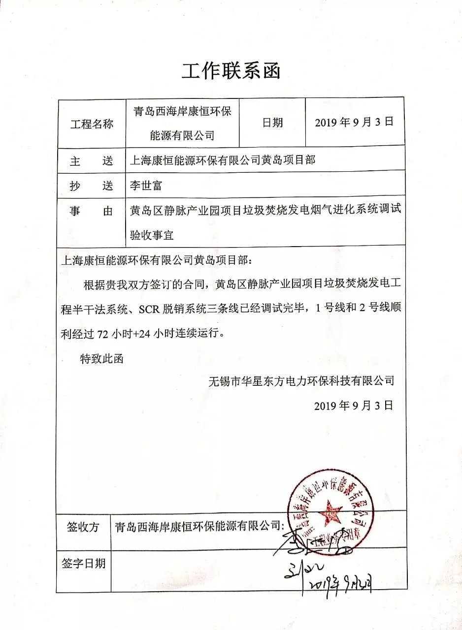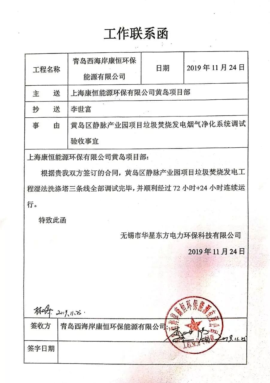我公司承建的青島黃島區(qū)靜脈產(chǎn)業(yè)園項(xiàng)目垃圾焚燒發(fā)電超低排放煙氣凈化工程于2019年11月24日通過72+24小時運(yùn)行驗(yàn)收。