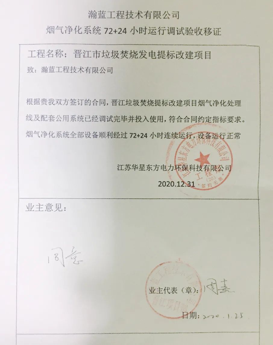 我公司承建的福建省晉江市垃圾焚燒發(fā)電提標(biāo)改建項(xiàng)目煙氣凈化工程于2020年12月31日通過72+24小時(shí)試運(yùn)行。