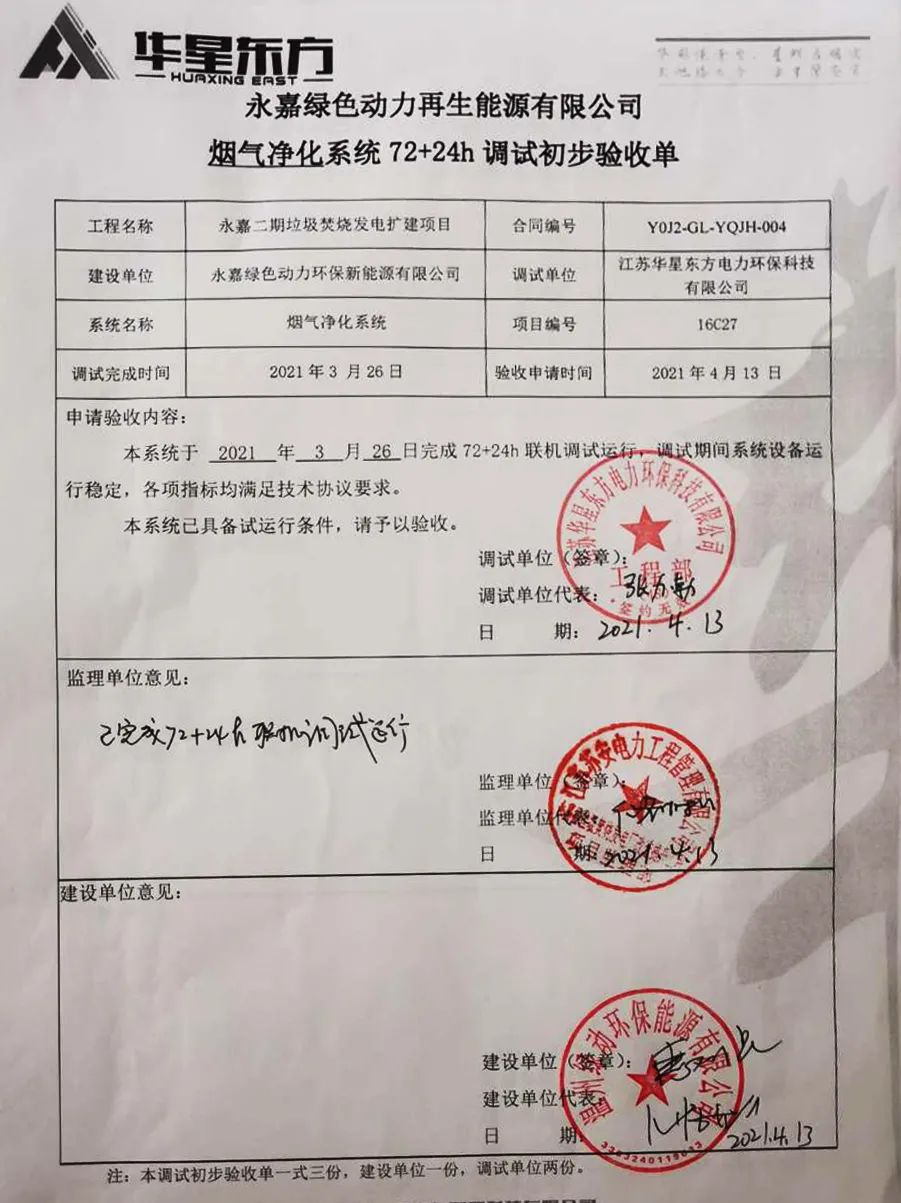 我公司承建的浙江省溫州市永嘉二期垃圾焚燒發(fā)電擴建項目煙氣凈化工程于2021年4月13日通過72+24小時試運行。