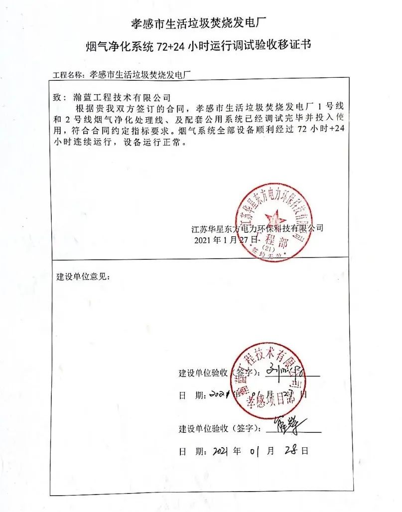 華星東方承建的湖北省孝感市生活垃圾焚燒發(fā)電項(xiàng)目煙氣凈化工程通過72+24小時(shí)試運(yùn)行