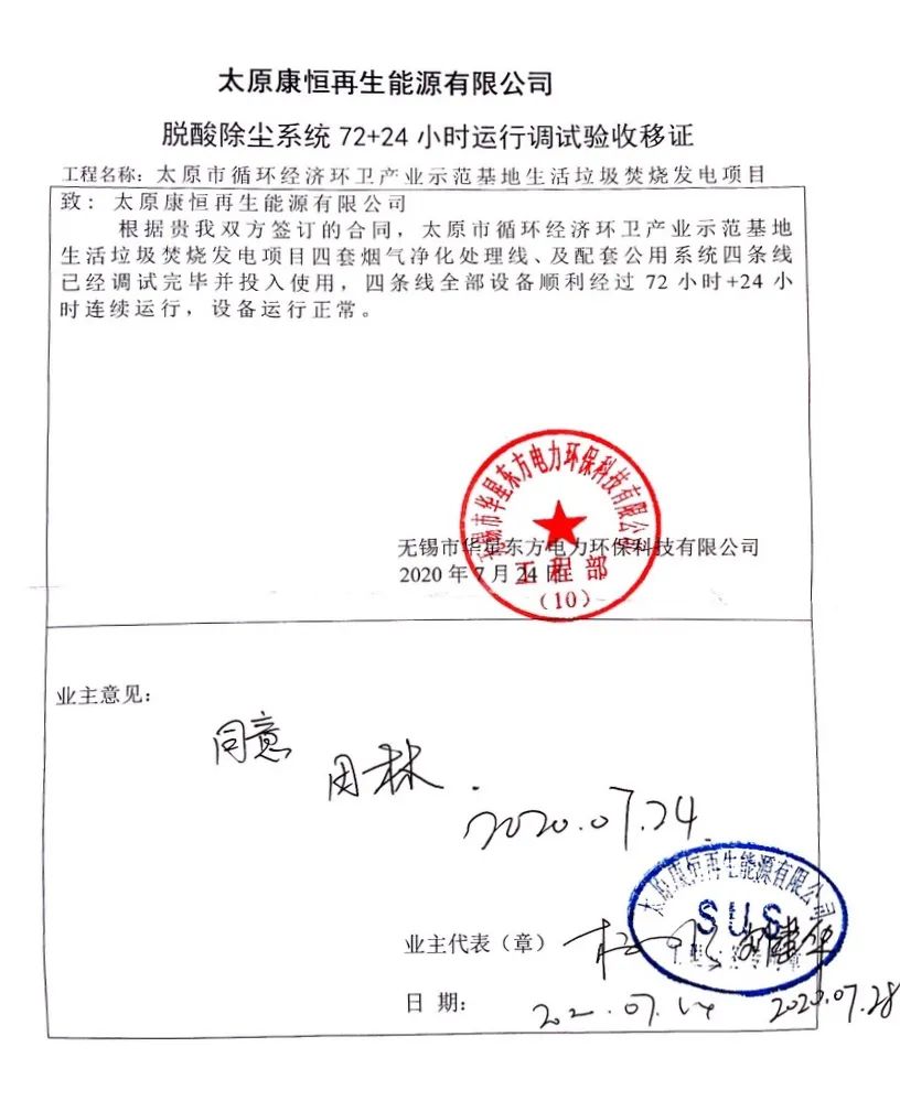 我公司承建的山西省太原市循環(huán)經(jīng)濟環(huán)衛(wèi)產(chǎn)業(yè)示范基地生活垃圾焚燒發(fā)電項目煙氣凈化工程于2020年7月28日通過72+24小時試運行。