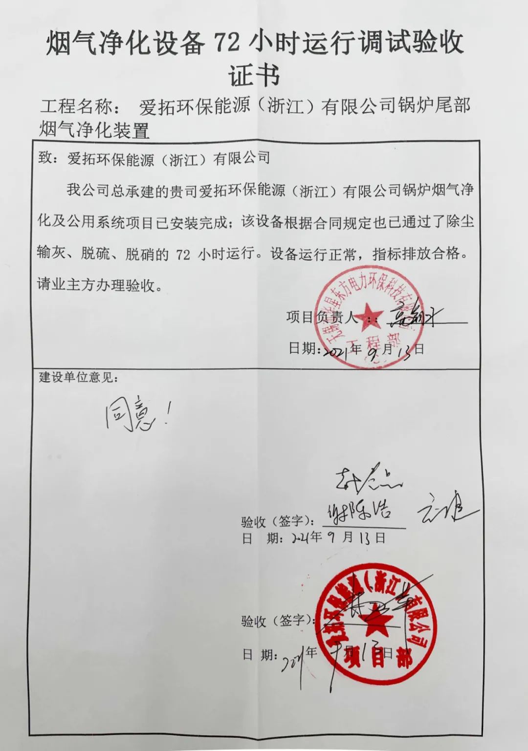 我公司承建的浙江省愛(ài)拓環(huán)保能源(浙江)有限公司鍋爐尾部煙氣凈化工程于2021年9月13日通過(guò)72+24小時(shí)試運(yùn)行。