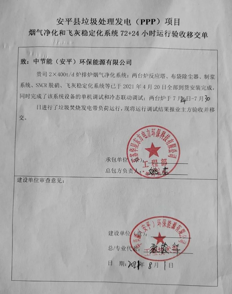 我公司承建的河北省衡水市安平縣生活垃圾焚燒發(fā)電項目煙氣凈化工程于2021年08月01日通過72+24小時試運行。 The FGC project constructed by Huaxing for Anping waste incineration power plant in Hengshui, Hebei passed 72+24 hours trial operation on August 01, 2021.