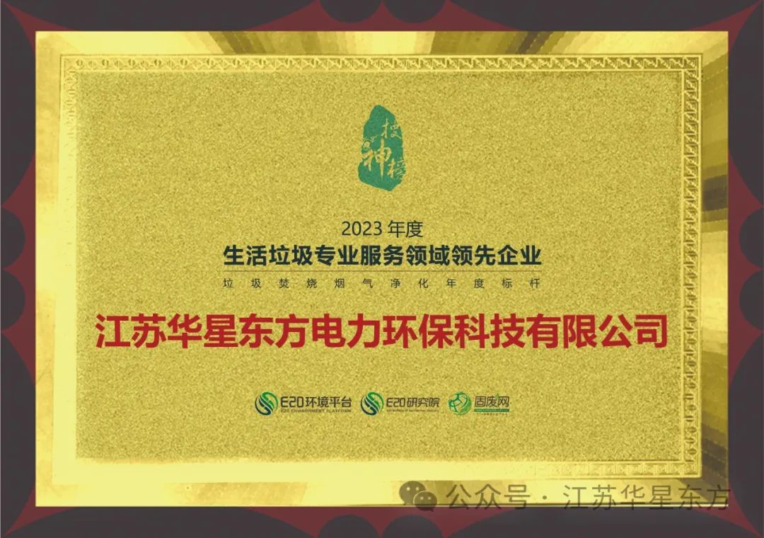 江蘇華星東方作為生活垃圾焚燒煙氣凈化領(lǐng)域領(lǐng)先的行業(yè)龍頭骨干企業(yè),在E20環(huán)境平臺2023年度評選中連續(xù)第八年獲選“煙氣凈化年度標(biāo)桿企業(yè)”。 As a leading industry leader in the field of domestic waste incineration flue gas cleaning, Jiangsu Huaxing East Co. was selected as the "Annual Benchmark Enterprise for Flue Gas Cleaning " for the eighth consecutive year in the 2023 annual selection of the E20 Environmental Platform.