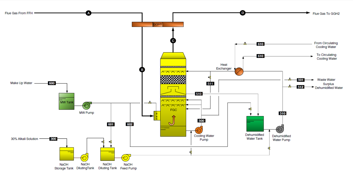 The single tower double circulation integrated tower technology is adopted, and the high-temperature flue gas enters from the lower part and is discharged after passing through the cooling absorption part and dehumidification absorption part. Acid pollutants, ultra-fine dust and aerosols are removed, and the gaseous water in the saturated flue gas is condensed and precipitated.