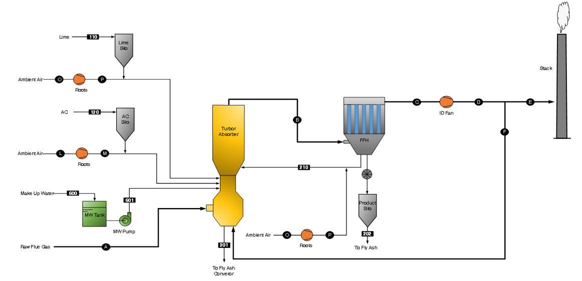 The raw flue gas and absorbent enter the reactor through the regulating rotor, and the reaction products are carried by the flue gas, separated by the dust collector, humidified by the return system and returned to the reactor. The humidified dust, absorbent and reaction products form a high concentration fast bed in the reactor, where the absorbent surface is constantly updated to promote the continuous deacidification reaction.