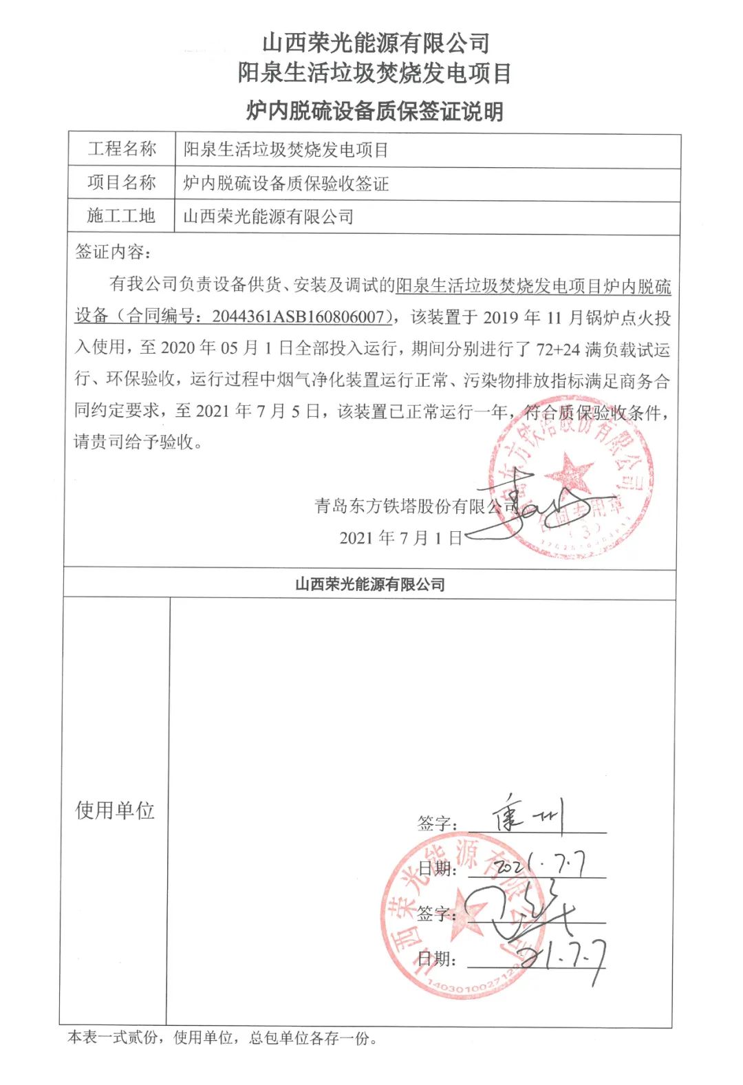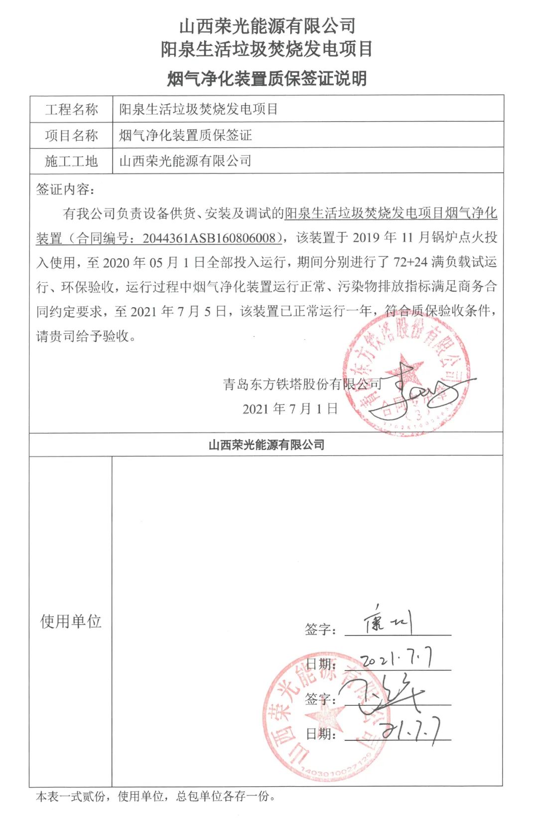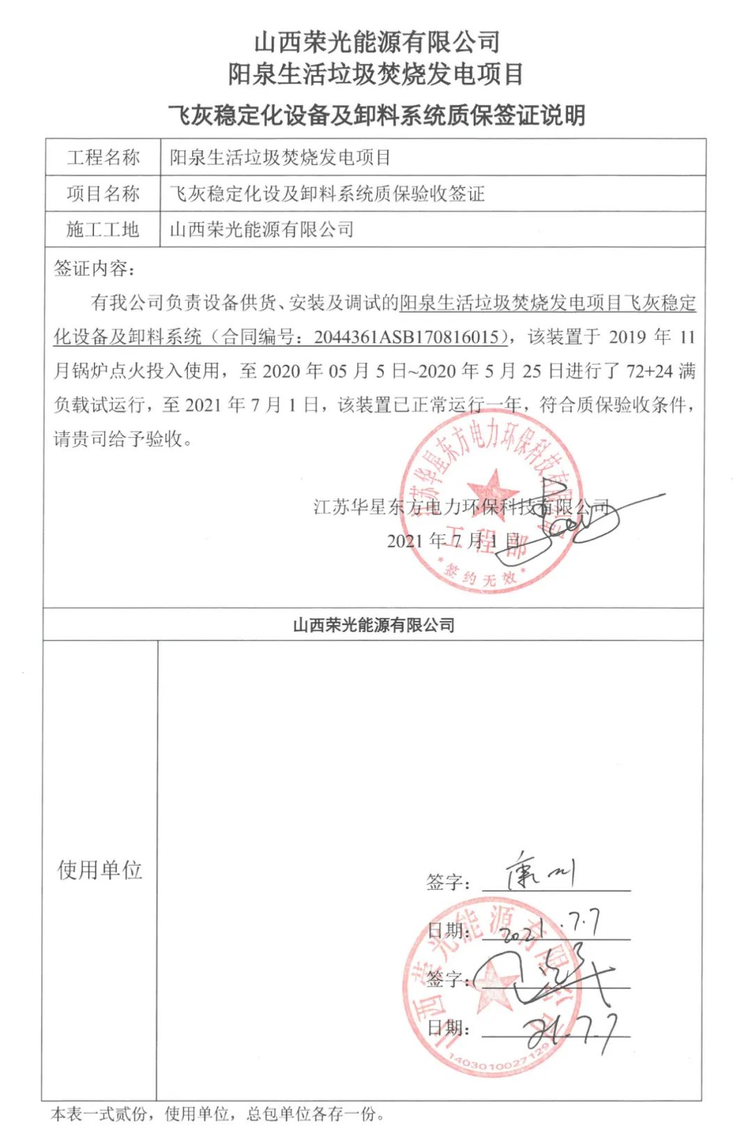 我公司承建的山西省陽泉生活垃圾焚燒發(fā)電項(xiàng)目煙氣凈化工程于2021年7月1日通過72+24小時(shí)試運(yùn)行。