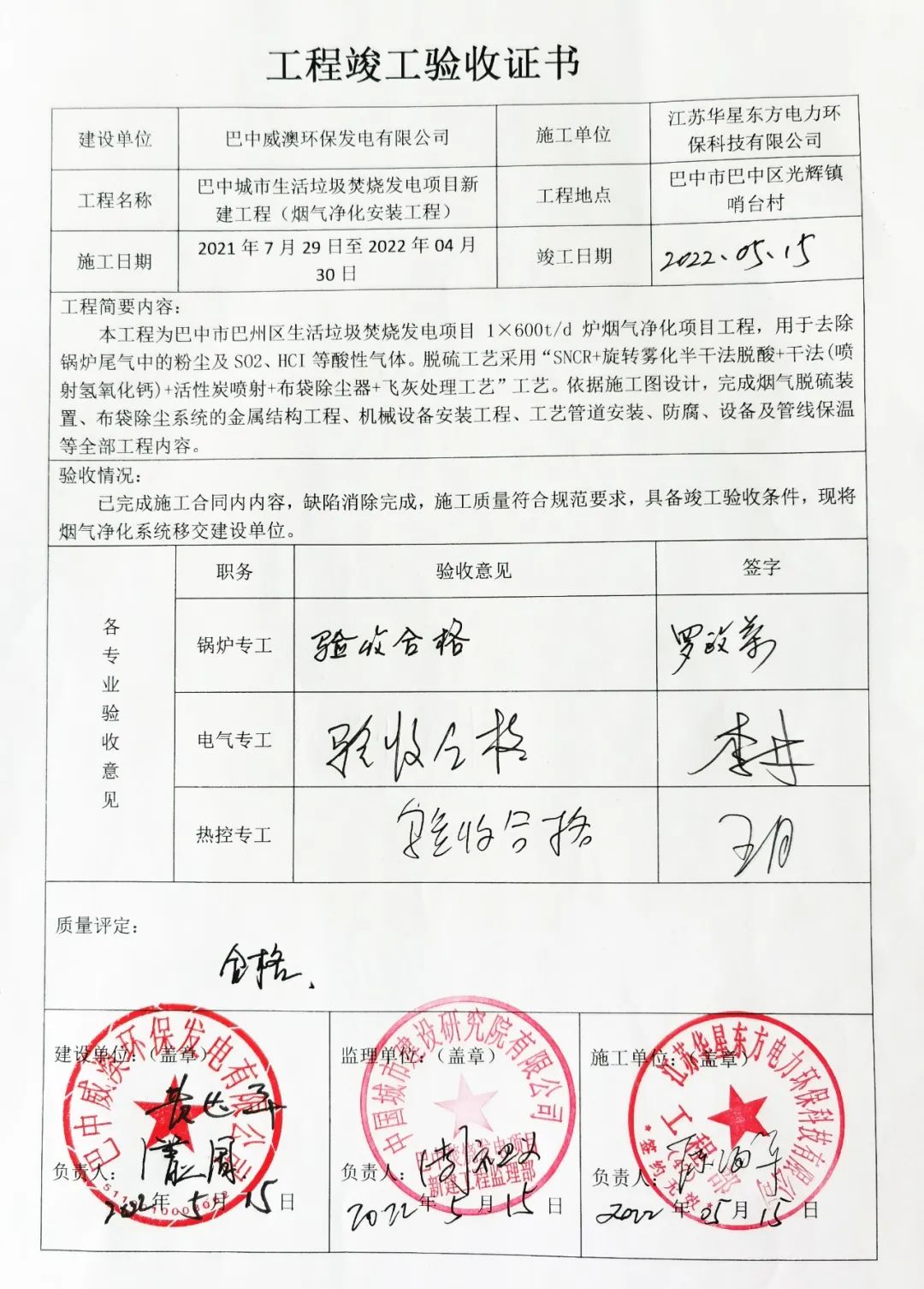 我公司承建的四川省巴中市垃圾焚燒發(fā)電項(xiàng)目二期煙氣凈化工程于2022年5月15日通過竣工驗(yàn)收。