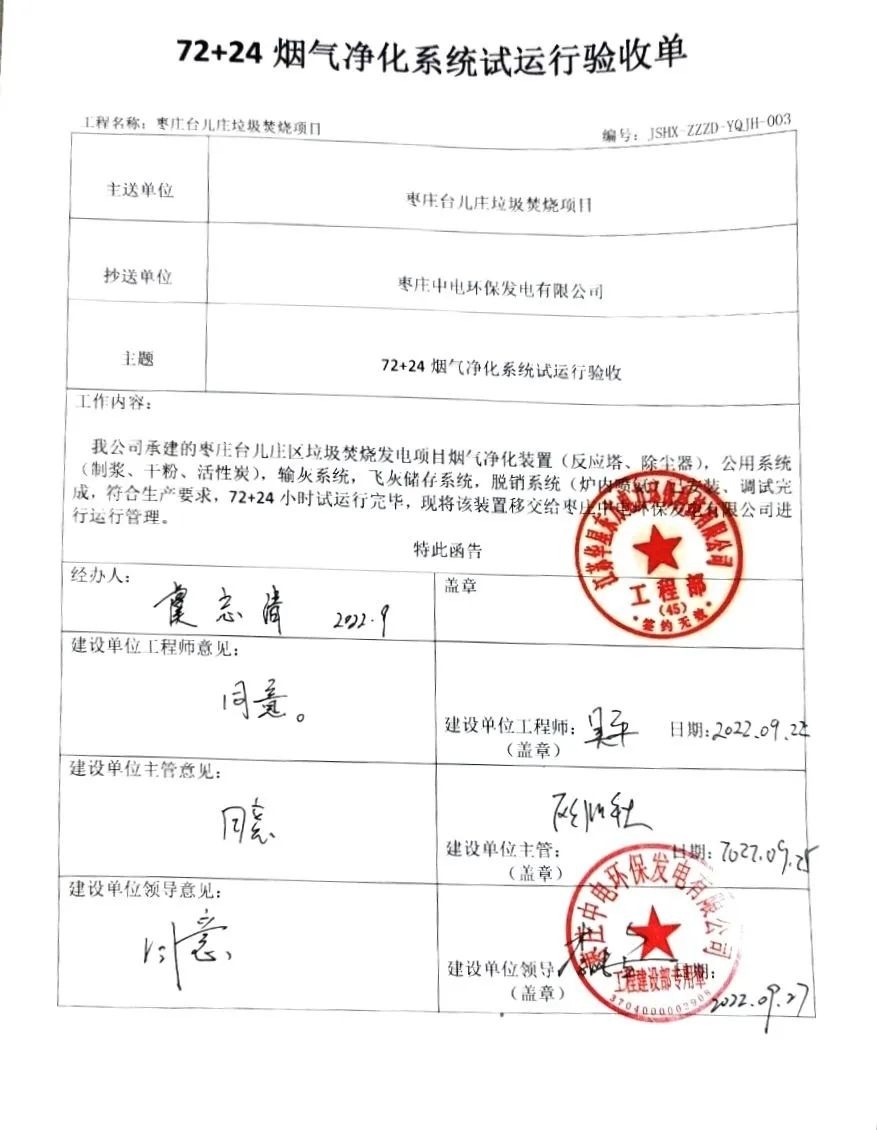 我公司承建的山東省棗莊市臺(tái)兒莊生活垃圾焚燒發(fā)電項(xiàng)目煙氣凈化工程于2022年9月22日通過(guò)72+24小時(shí)試運(yùn)行。