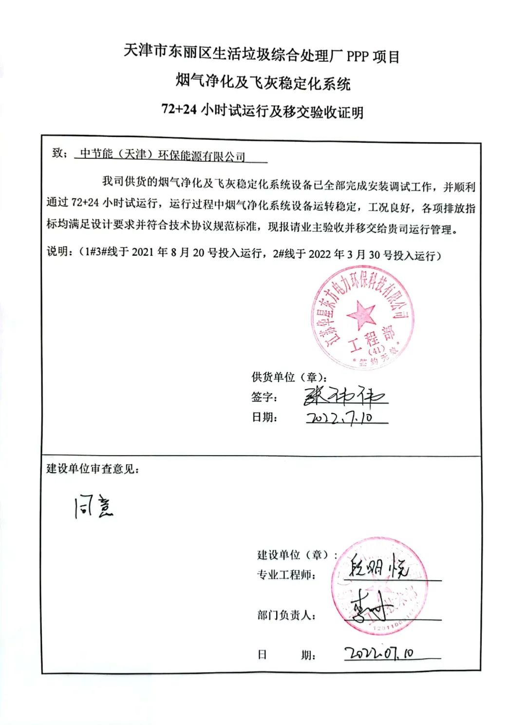 我公司承建的天津市東麗區(qū)生活垃圾焚燒發(fā)電項目煙氣凈化工程于2022年07月10日通過72+24小時試運(yùn)行。