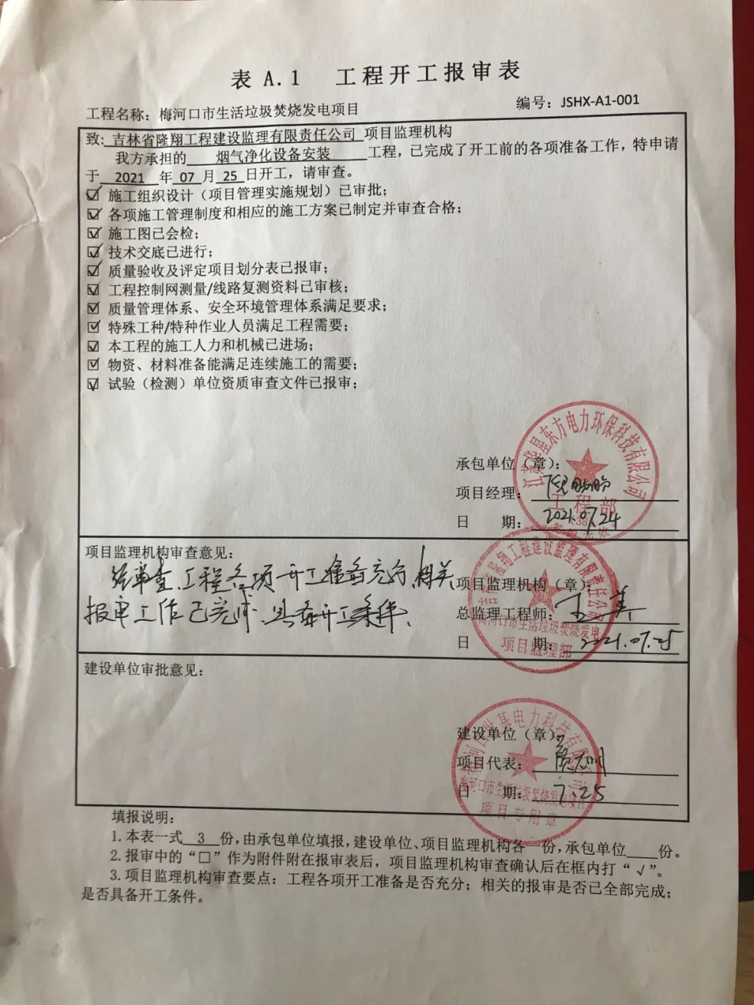我公司承建的吉林省梅河口市生活垃圾焚燒發(fā)電項目煙氣凈化工程于2021年07月25日開工建設(shè)。 The flue gas purification project of Meihekou Domestic Incineration Power Generation Project undertaken by our company was commenced on July 25, 2021.