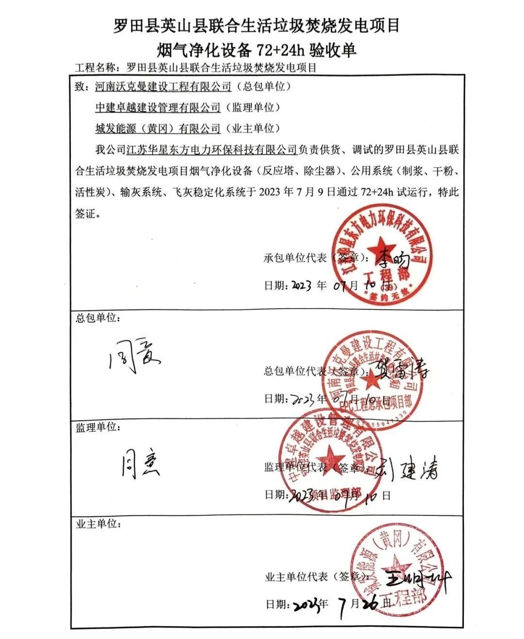 我公司承建的湖北省黃岡市羅田生活垃圾焚燒發(fā)電項目煙氣凈化工程于2023年07月09日通過72+24小時試運行。 The flue gas purification project of the Luotian domestic waste incineration power generation project in Huanggang City, Hubei Province, undertaken by our company, passed the 72+24-hour trial operation on July 9, 2023.